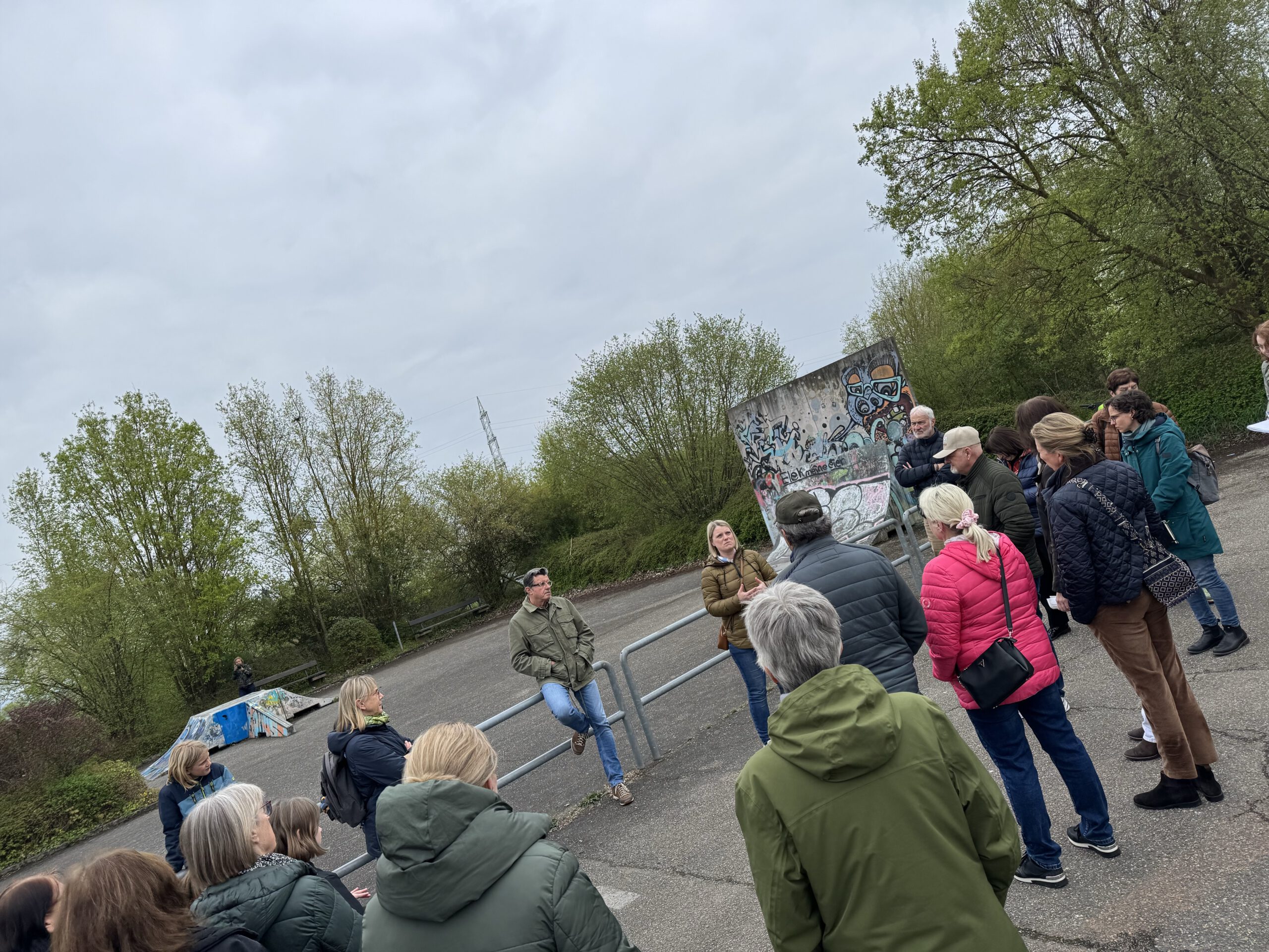 Der Spaziergang startete an der Skateanlage am Kugelberg, deren Zustand Anlass zur Diskussion bot. Die Jugendlichen wünschen sich dort einen Dirtpark, da die Anlage alt, gefährlich und wenig attraktiv ist. Bürgermeisterin Schwarz nimmt dieses Anliegen mit und will prüfen, welche Möglichkeiten es in Hoheneck geben könnte.